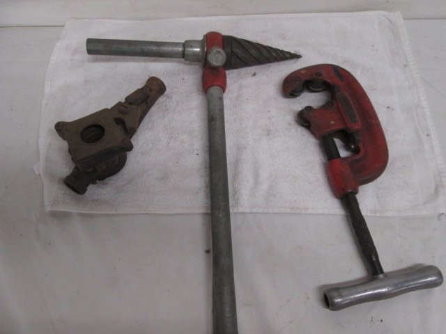 Ridgid 4 wheel pipe cutter and pipe reamer with Walworth Mfg Co Boston pipe part. All in good usable condition. Please preview.