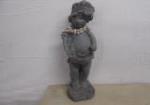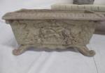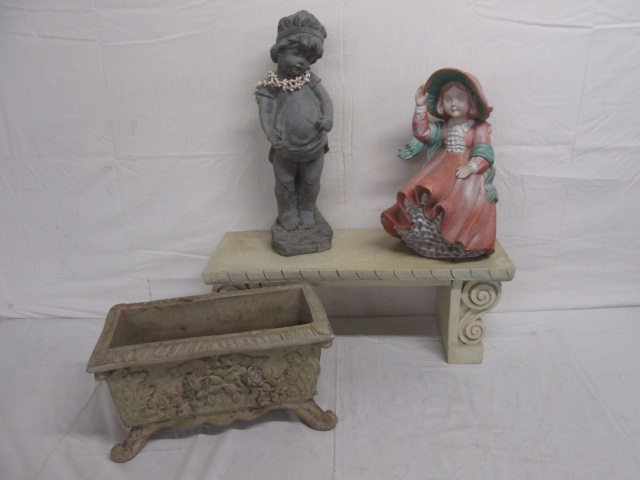 Petite decorative garden bench with planter and two garden statues the garden bench measures 25 in Long by 9 and 1/2 in tall by 9 in deep. The planter measures 9 inches tall by 16 inches long by 9 in wide. The garden statues are 15 in and 19 in tall. Overall good condition, made of resin and ceramic. Please preview.