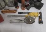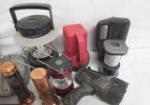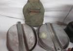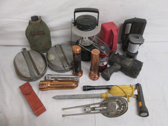 Aluminum camping dishes with a canteen and assorted flashlights. Comes with a propane burner and assorted flashlights that are vintage and newer models. Overall good condition, please preview.