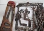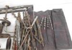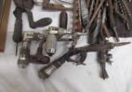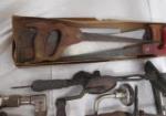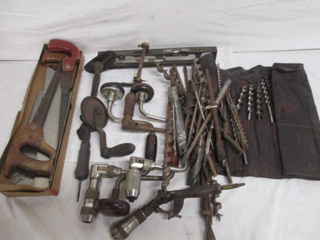 Box lot of hand saws, vintage hand crank drills and an assortment of drill bits. Please preview.