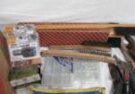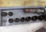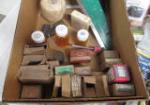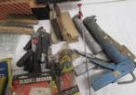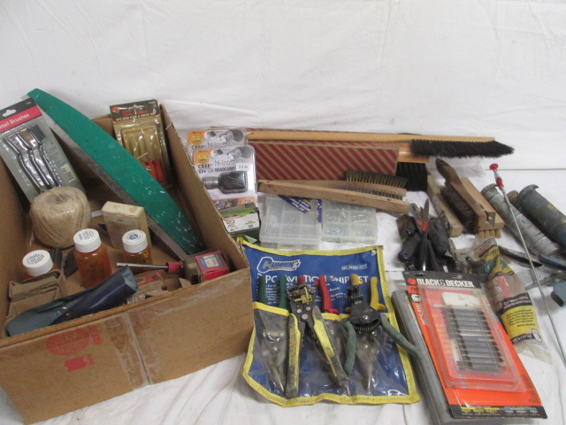 Box lot of tools including wire strippers, various brushes, caulk guns and more.