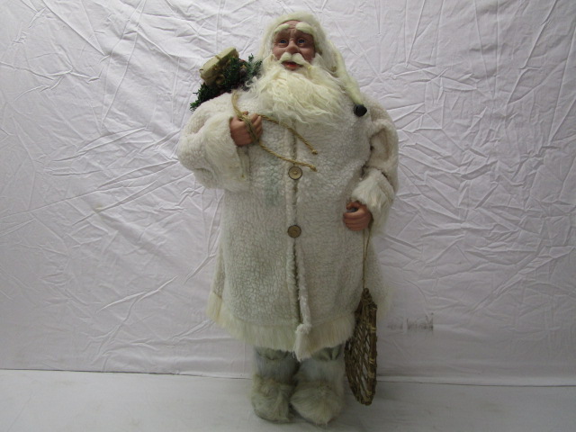 This adorable 36" vintage style Santa Clause figure features a thick coat (with wooden buttons), faux fur boots, snow shoes and a red sack. This item is in previously owned, good condition. Please preview.