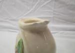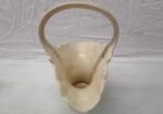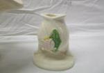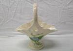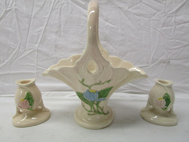 Vintage Hull Art Pottery set consists of a basket vase and two matching candle holders in the Magnolia pattern, likely produced in the late 1940s. The basket measures approximately 11 in tall by 10 in wide and the candlesticks are four and a half inches tall. There are tiny chips along the Baseline of the vase and two larger chips in the rim of one of the candlesticks. Please preview.