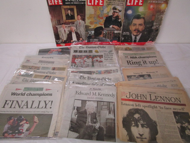 This large selection of collectible ephemera includes three editions of "Life Magazine" (9/16/1957, 8/19/57, and 4/15/57 ), copies of sports related editions of the Boston Globe celebrating Victories, Newspaper editions related to the slaying of John Lennon, and more. These items are in previously owned condition. Please preview.