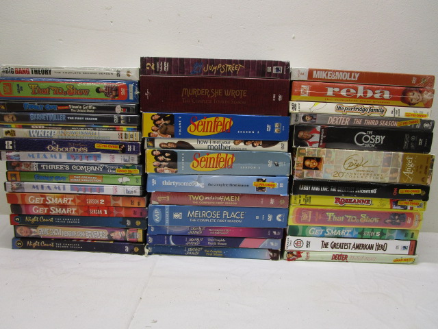 This collection of 39 DVDs/DVD sets features a variety of television series including "Get Smart", "Dexter, The Third Season", "Three And A Half Men" and more. These DVDs are in previously owned, good condition. Please preview.