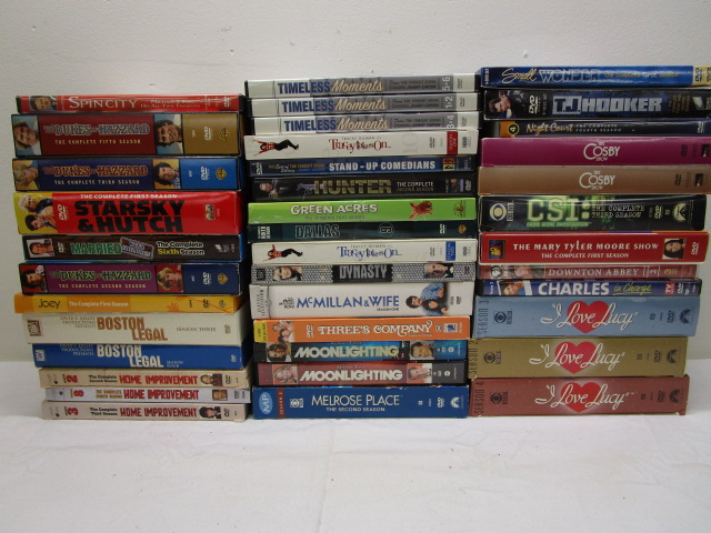 This collection of 39 DVD/ DVD sets features a variety of television series including "I Love Lucy", "Moonlighting", "Green Acres", "Dallas" and more. These DVDs are in previously owned, good condition. Please preview.