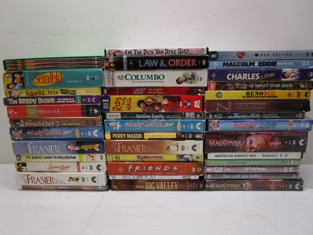 This collection of 39 DVDs/DVD sets feature a variety of television series including "Friends", "Columbo", "Seinfeld" and more.These DVDs are in previously owned, good condition. Please preview.