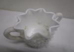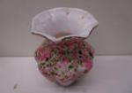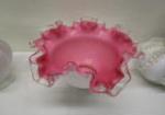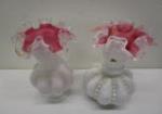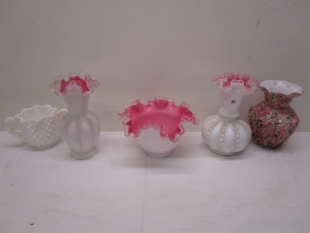 This stunning collection of five pieces of vintage Fenton art glass includes a 5-1/2" Fenton Rose Aventurine style ruffled vase, a 3" Fenton Milk Glass Hobnail Open sugar bowl, a Beaded Melon pink and white vase, and two pink and white Fenton Swirl vases. These items are in previously owned condition. Please preview.
