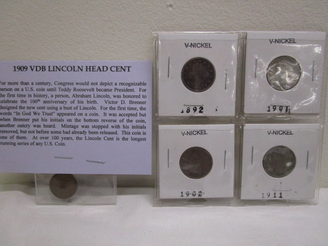Four V-nickels from 1892 to 1911 and a 1909 VB Lincoln penny. Coins are in used, good condition but please preview as the pictures do not show true condition.