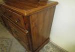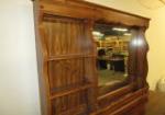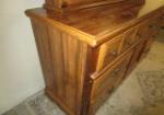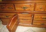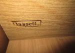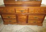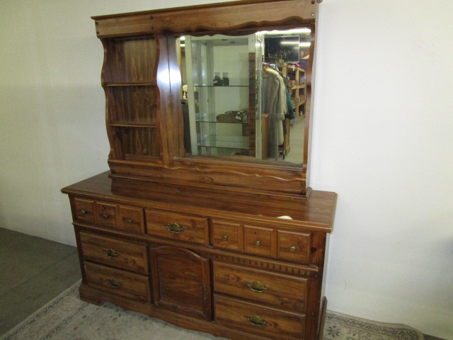 This vintage, Bassett brand triple dresser features a hutch top mirror top with three open shelves. The lower dresser section features three smaller drawers over two larger drawers and a middle storage area. This item measures 62"W 18"D X 72"H. This item has minor wear that can easily be touched up. Overall this item is in previously owned, good condition. Please preview.
