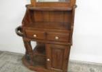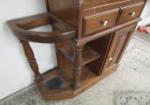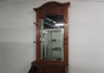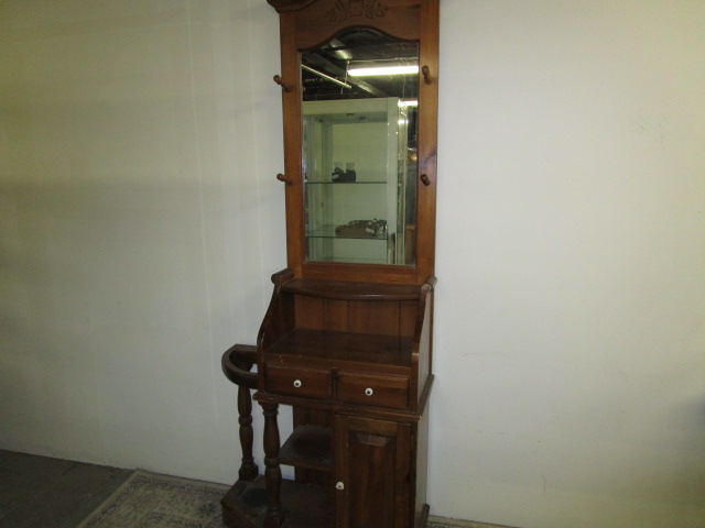 This nice vintage hall tree features a mirror, four peg style hooks, a shelf, a built in umbrella stand and two drawers. This item measures "W X "D X "H. This item does have minor wear due to, use but is in overall previously owned, good condition. Please preview.