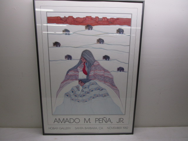 This impressive, 22-1/2" X 31" vintage gallery poster, features artwork by Amado M. Pena Jr. for an exhibition at the Hobar Gallery in Santa Barbara, California in 1982, is in previously owned, very good condition. Please preview.