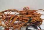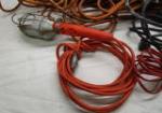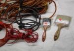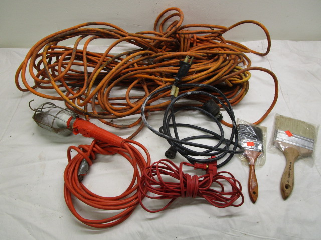 This assortment of construction/work items includes three extension cords, a utility/drop light (cord has been repaired) and two paint brushes. These items have not been tested and are being sold as is. They are in previously owned condition. Please preview.