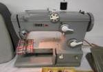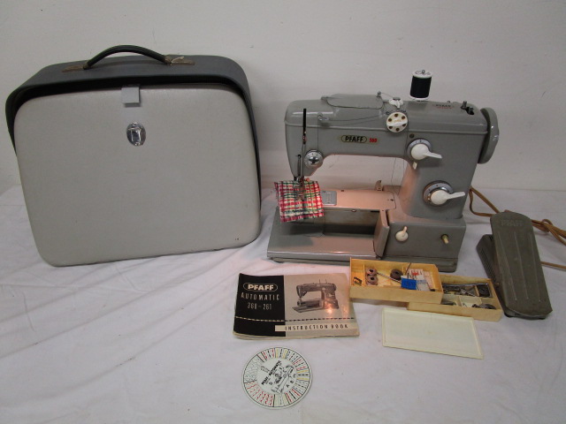 This vintage PFAFF heavy-duty metal automatic sewing machine (model # 360-261) comes in its case, however the lid top hinges will need repair. The sewing machine has been tested and does power up, the lights do come on and parts move freely. It will require normal maintenance. It is being sold as is. Please preview.