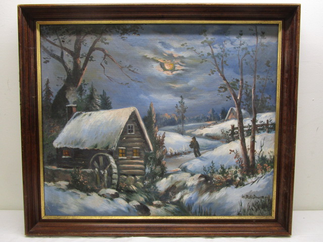 This beautiful 26-1/2" X 22-1/2" original, nighttime landscape painting (on canvas) by W. Duke Downs is in previously owned, good condition. Please preview.