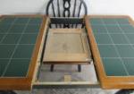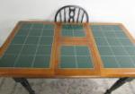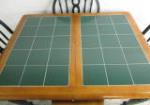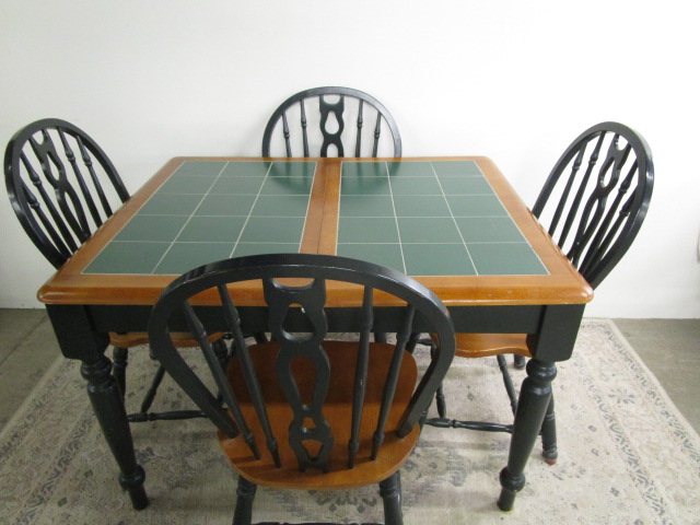 This stylish wood dining room table set features a light wood finish, dark green (faux) tile style top and four Windsor-style chairs in a contrasting black finish. This table has an interesting 15" extension leaf that drops down into the table when not in use. This table measures 35"W X 60"L (when the leaf is extended) and 45" when the leaf is not in use. This item has minor wear but is in overall previously owned, good condition. Please preview.