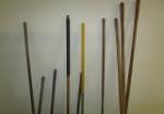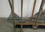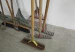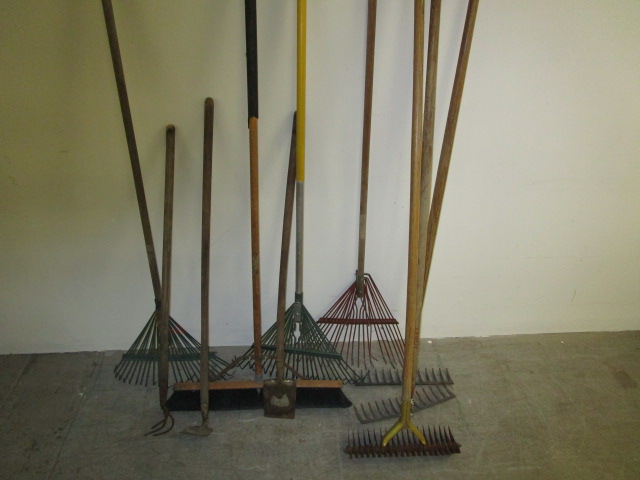 This assortment of ten yard care tools includes leaf rakes, garden rakes, a large push broom, a garden hoe and a three prong leaf rake. These items are in previously owned condition. Please preview.