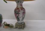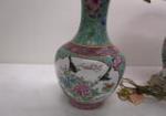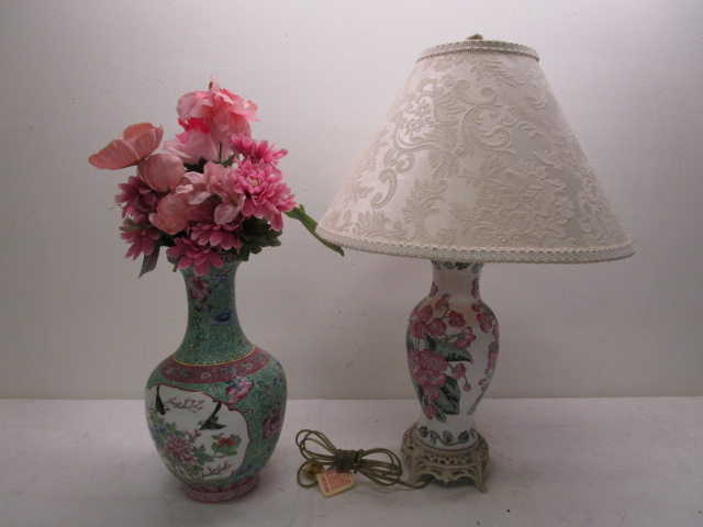 This pair of lovely home decor pieces includes a 13" "Kings" brand Chinese porcelain vase featuring a green sgraffito ground with a hand painted floral/bird motif. Also included is a 22" vintage Chinese-style table lamp featuring beautiful pink flowers. These items are in previously owned, good condition. The lamp has not been tested and is being sold as is. Please preview.