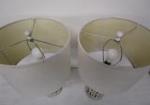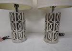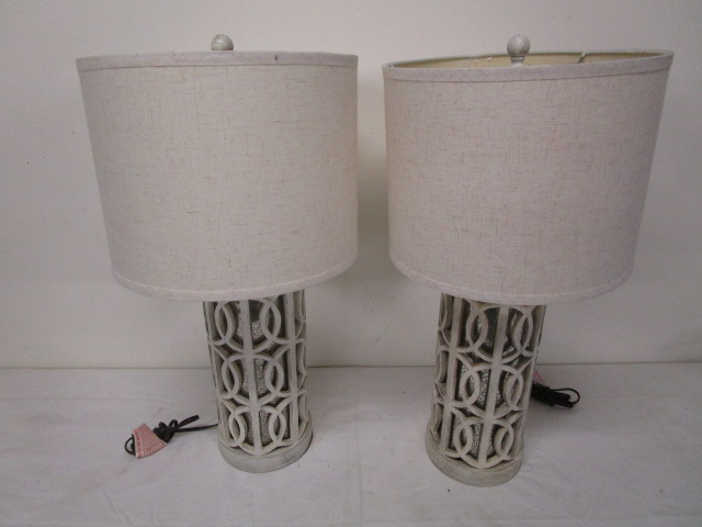 This darling pair of 24" Hobby Lobby Art Deco Mercury table lamps feature a unique wooden overlay on a silver mercury style body. These lamps also have lovely cloth shades. These items are in previously owned, good condition. These lamps have not been tested and are being sold as is. Please preview.