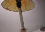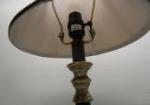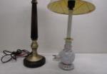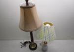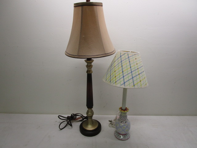 This pair of lovely table lamps includes a 30" brass and wooden style candlestick table lamp (with a tan cloth shade) and a 21" MacKenzie-Childs style ceramic globe table lamp. These items are in previously owned condition. These items have not been tested and are being sold as is. Please preview.