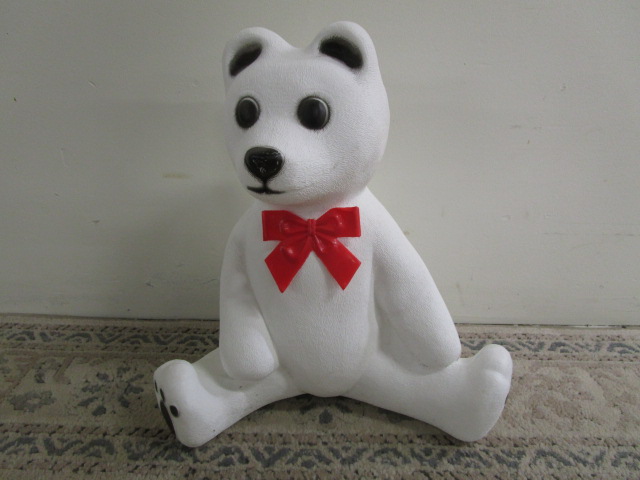 This adorable 18" Union Products (of Leominster Ma.) white bear with a red bow blow mold is in previously owned, good condition. Please preview.