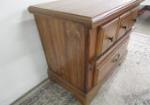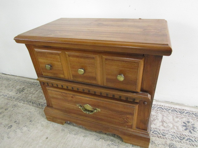 This very nice traditional night stand features two drawers and lovely hardware. This piece measures 26"W X 15"D X 23-1/2"H. This piece has some minor damage to the edge of the back of the piece as shown in photo #6. This item is in previously owned condition. Please preview.