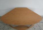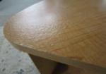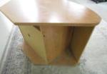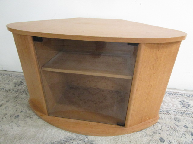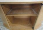 This interesting blonde wood veneer media cabinet features a curved silhouette and glass doors. This item measures 35"W X 19-1/2"D X 21"H. This media center does have some wear (bubbling) as shown in photos #5 and 6. This item is in previously owned condition. Please preview.