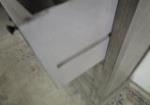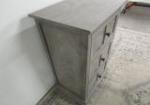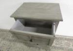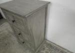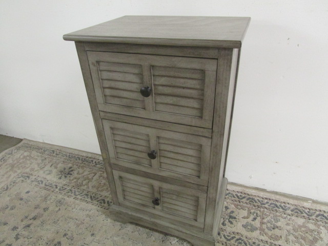 This adorable three drawer side table features a louvered door design and nice hardware. This item measures 16"W X 12-1/2"D X 28-1/2"H. This item is in previously owned, very good condition. Please preview.