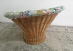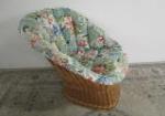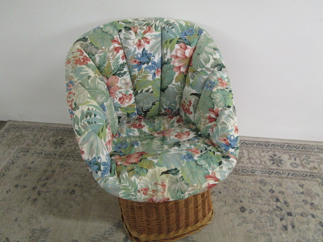 This adorable "tub-style" chair featuring a rattan base and floral upholstery measures approximately 26"W X 29"D X 28-1/2"H. This item is in previously owned, good condition. Please preview.