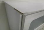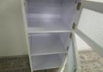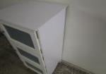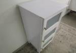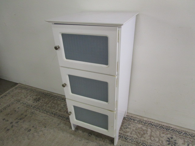 This very nice white composite narrow storage cabinet features three storage areas. The narrow design is designed for space-saving efficiency. This item measures 16"W X 15"D X 34-1/2"H. This item is in previously owned, good condition. Please preview.
