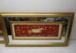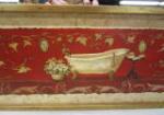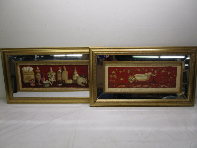 This beautiful pair of 27" X 15" vintage-style decorative wall art prints feature a bathroom related theme. These prints are complimented with ornate gold toned framed with mirrored trim. These items are in previously owned, good condition. Please preview.