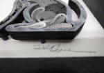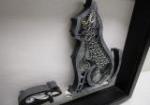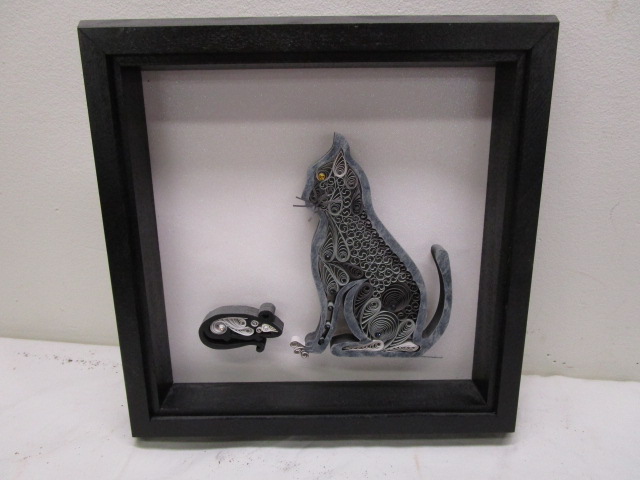 This adorable 10-1/2" X 10-1/2" Rob Crane art work piece features the ancient art of "Quilling". This piece depicts a cat and mouse design using curled paper to form the subjects. Swarovski crystals were used to highlight the bodies of the cat and mouse. The history of this piece is included. This item is in previously owned, very good condition. Please preview.
