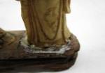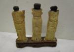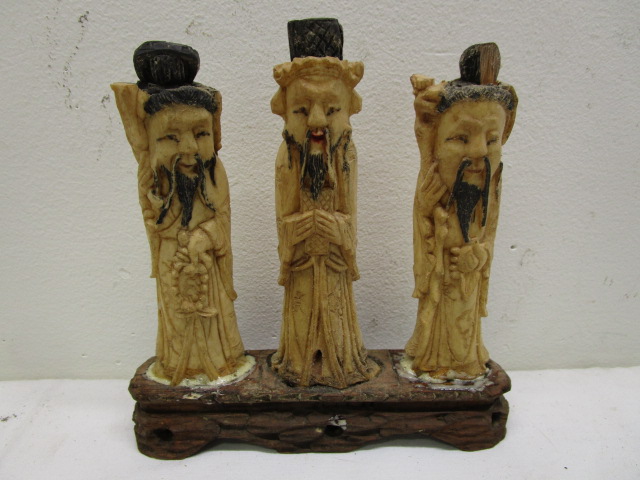 This interesting 6"W X 6"H, Chinese hand carved wooden piece depicts three Chinese deities. There is a small chip on the figure on the right as shown in photo #1. This item is in previously owned condition. Please preview.