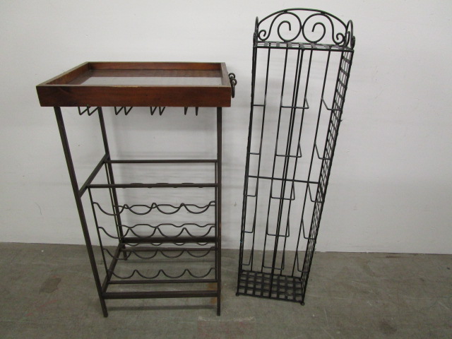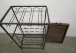 This pair of metal home decor items includes a stylish stationary bar featuring a removable glass top tray, a 16 bottle storage rack and a glass rack. Also included is a nice black C.D. holder. The bar stand measures 17"W X 15"D X 36"H. The C.D. holder measures 11"W X "D X 46"H. These items are in previously owned, good condition. Please preview.
