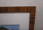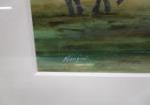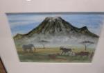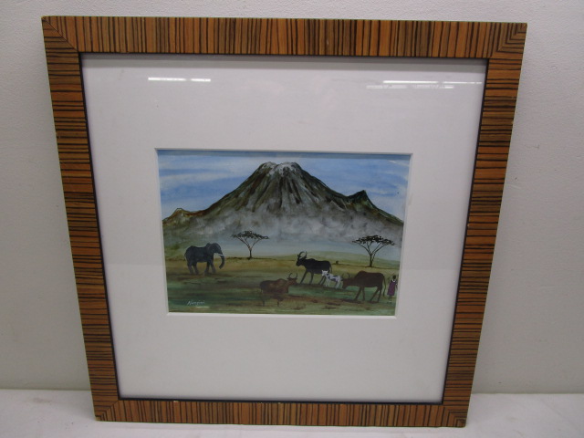 This gorgeous 19-1/4" X 19-1/4" original painting by Maasai artist Nangini of East Africa. This painting depicts an African landscape featuring a mountain, animals and a Maasai woman. This painting is housed in a brown and tan striped frame which complements the colors in the art work. The frame does have a few minor scratches. The painting is in previously owned, good condition. Please preview.
