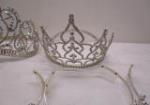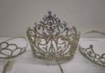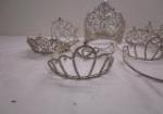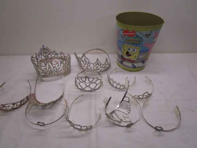 This collection of a dozen sparkling "Princess" (some adjustable) party crowns. Also included is a Spongue Bob pail. These items are in previously owned condition. Please preview.