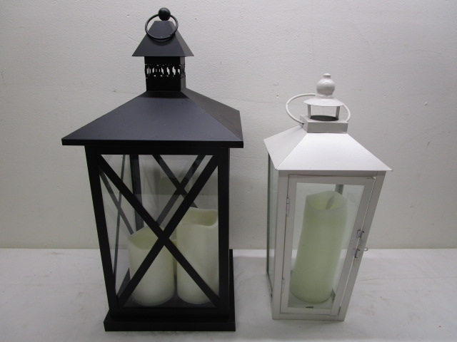 This pair of very nice lantern bases feature battery operated candles. This pair includes a 19" black lantern with three battery operated candles and a 16" white lantern with one battery operated candle. These items are in previously owned, good condition. They have been tested and do work.