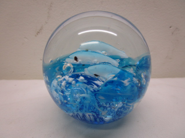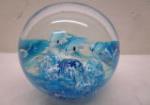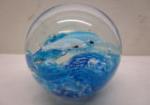 This very unique 3" collectible "Mirano" style glass paperweight features internal swirls of blue and white to represent waves with dolphins swimming inside. This item is in very good condition. Please preview.
