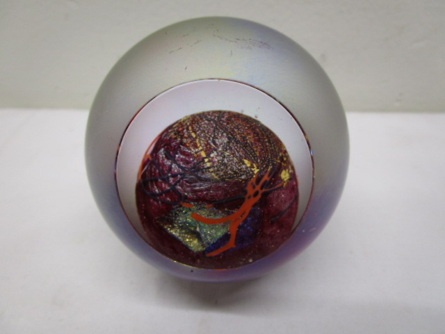 This fantastic handcrafted, iridescent art glass paperweight was produced by Glass Eye Studios. The Glass Eye Studios are known for their use of dichroic glass and pieces often include ash from the 1980 eruption of Mt. St. Helens. This item is in very good condition. Please preview.