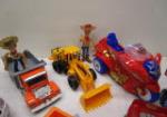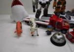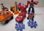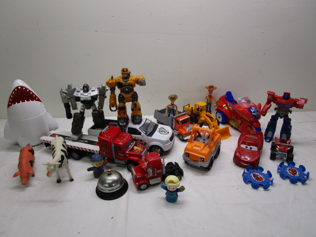 This assortment of over fifteen collectible figures includes a trio of Transformer action figures (including Megatron, Bumblebee and Optimus Prime), a Transformation Robot Motorcycle, two Toy Story "Woody" figures, a talking Lightning McQueen car and "Mack" truck from the movie "Cars" and more. The Optimus Prime character is missing an arm, other items are in previously owned condition. Please preview.