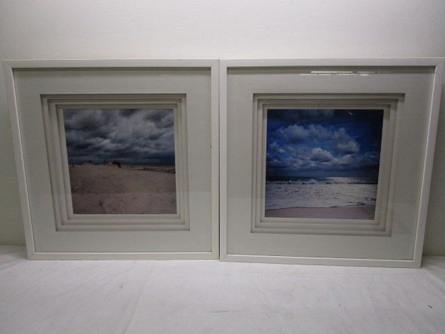This absolutely stunning pair of 20-3/4" X 21" coastal photographs are housed in lovely white deep-set multi layered style frames. These items are in previously owned, good condition. Please preview.