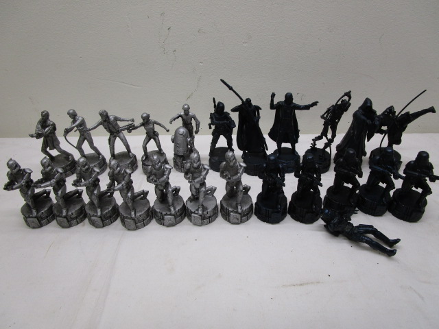 This Interesting, collection of 24 pieces from the Star Wars saga Edition Chess Set released by Hasbro in 2005 are in good condition with the exception of one piece (missing the stand). This is a partial set as there are 32 pieces in a complete chess set. Please preview.