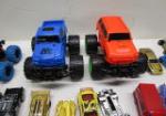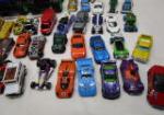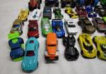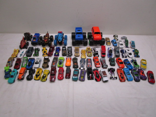 This large assortment of over 65 vintage collectible cars includes the 2010 Hot Wheels Batman car, a die-cast metal Dodge Daytona, a Hot Wheels Harley Quinn power Piston and more. These items are in previously owned, vintage condition. Please preview.