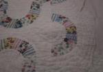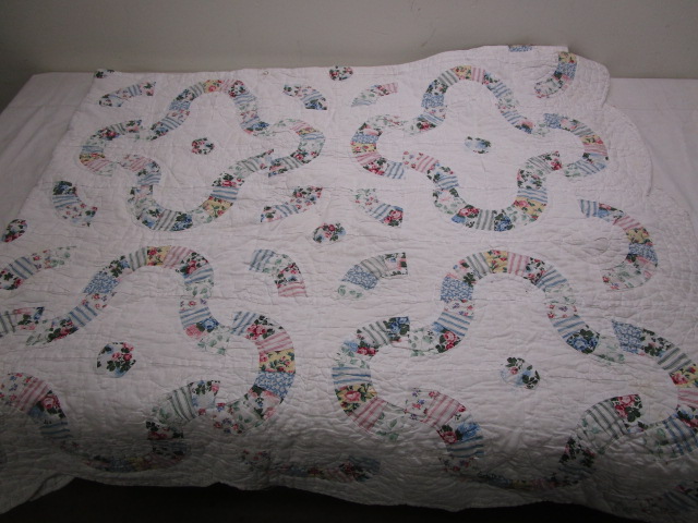This darling "Ring Arches" pattern quilt features a white cotton blend and floral patterns. This quilt measures approximately 82" X 70" . It will need to be washed due to storage but is otherwise in previously owned, good condition. Please preview.