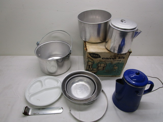 12 piece Camp kit with enameled coffee pot. All in good condition, please preview.