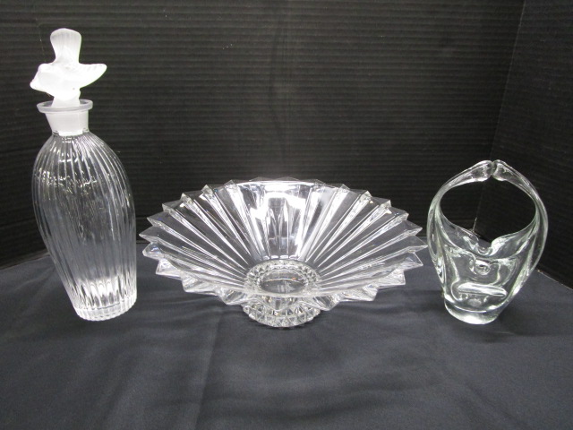 Rosenthal Crystal console Bowl, jar with frosted bird stopper and hand blown glass basket. There is a small chip on the point of the bowl, the basket and the bottle do not have any damage. Please preview.