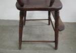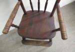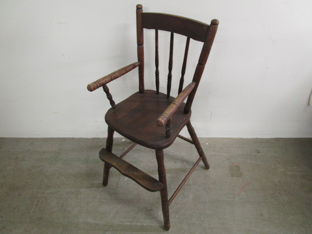 Antique wooden child's high chair featuring a spindle back design. Victorian or Primitive style, often constructed from hardwoods like oak. Chair is in good solid condition, does show Surface wear and does not come with tray. Please preview.