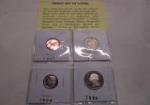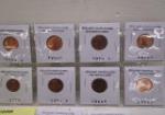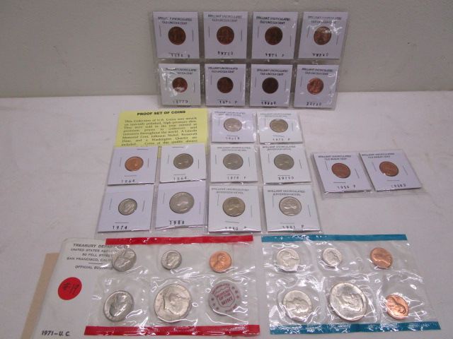 A lot of six Jefferson nickels from 1961 to 1981 in brilliant uncirculated condition, ten Lincoln pennies from 1956 to 2008 in brilliant uncirculated condition, a 1971 UC set, and a set of proof coins including a penny, nickel, dime and a quarter. Please preview as pictures do not show true condition.